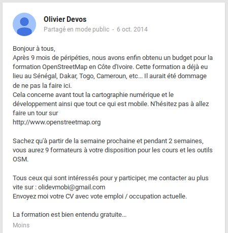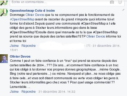 Je me pose encore la question, de savoir comment un intellectuel qui se respecte et qui dénigre Openstreetmap peut-il accepter de faire une formation sur openstreetmap parce qu'il y a un chèque à la clé : j'ai honte à ta place, tu n'es qu'un affamé sans scrupule mais les ivoiriens sauront bientôt qui tu es en réalité.
