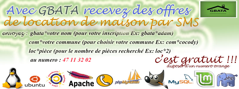 Pour souscrire à GBATA et recevoir des alertes d'offres immobilières sur toute l'année, il suffit d'envoyer le message Gbata*votre_prenom par SMS au +225 47 11 32 02. Ensuite, sur instruction du serveur Jerry, vous indiquerez la commune de votre choix et le nombre de pièces recherché par sms. Tout ceci est ensuite mémorisé par l'application GBATA qui vous diffuse chaque jour toutes les offres respectant vos critères. Gbata c'est aujourd’hui plus de 775 offres diffusées par sms à environ 420 abonnées. Les initiateurs en plus d'affiner leur prototype au fil des requêtes des utilisateurs de leur application, gagnent en compétences et aujourd'hui sont sollicités pour animer des ateliers de développement d’applications SMS dans les écoles d’ingénieurs et autres Fablabs d'Abidjan.
